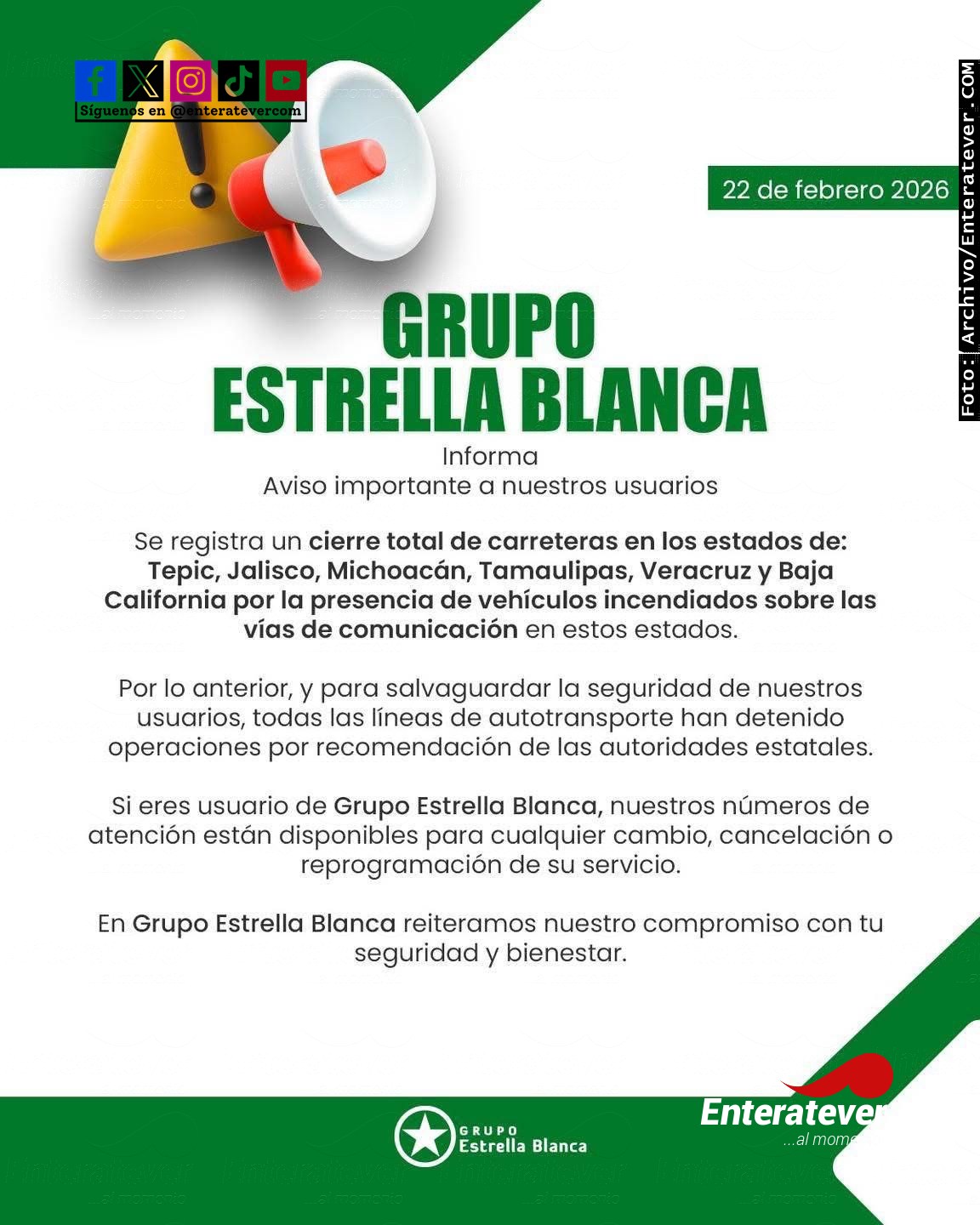 La empresa Grupo Estrella Blanca informó que la suspensión de operaciones se realizó por recomendación de autoridades estatales, con el objetivo de priorizar la seguridad de pasajeros y operadores ante el riesgo en las carreteras.