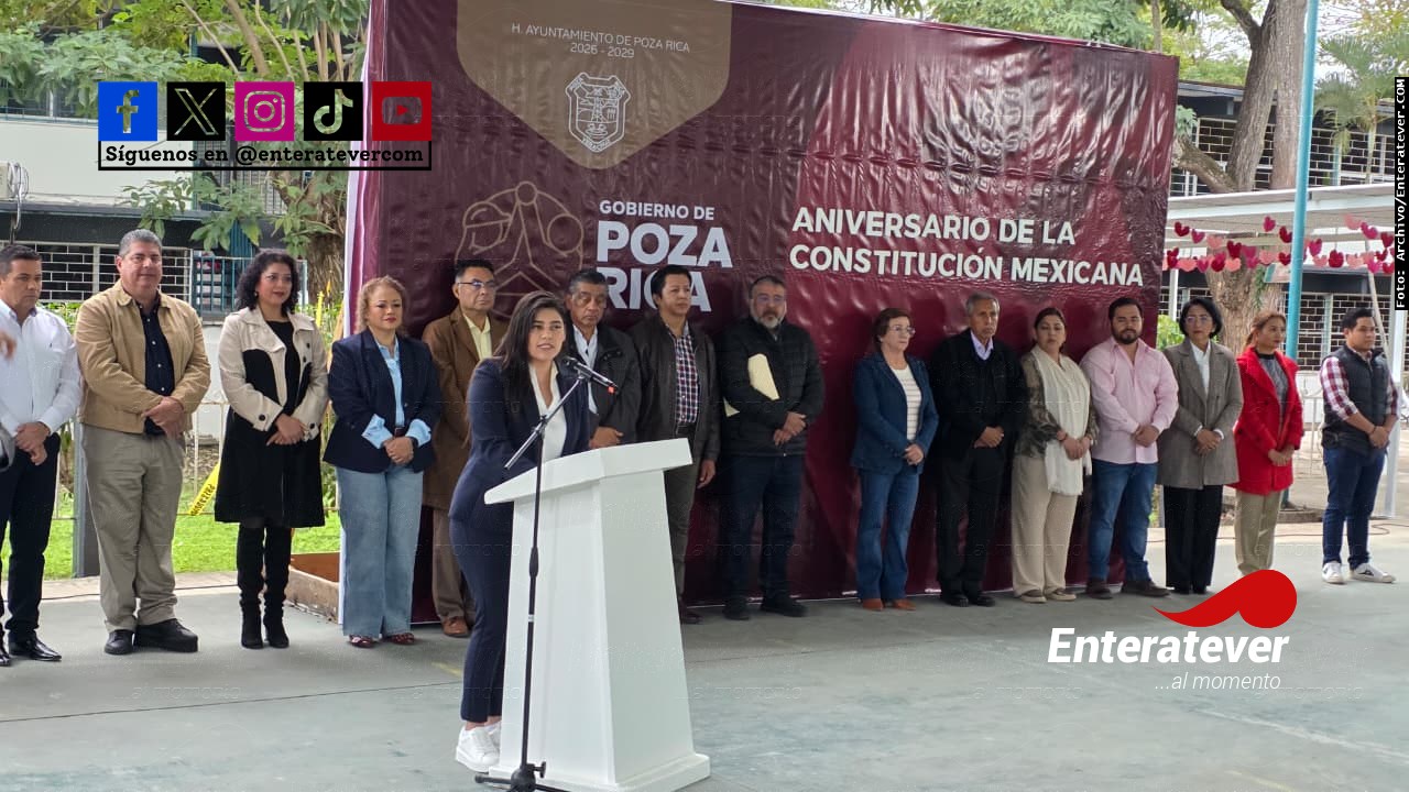 Poza Rica, Ver.- En el marco del aniversario de la promulgación de la Constitución Política de los Estados Unidos Mexicanos, el Gobierno de Poza Rica llevó a cabo un acto cívico en la Escuela Secundaria Federal No. 1 “Heriberto Jara Corona”, encabezado por la presidenta municipal Adanely Rodríguez Rodríguez.