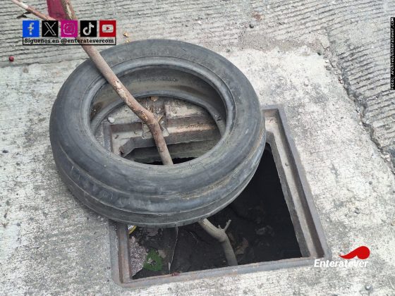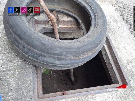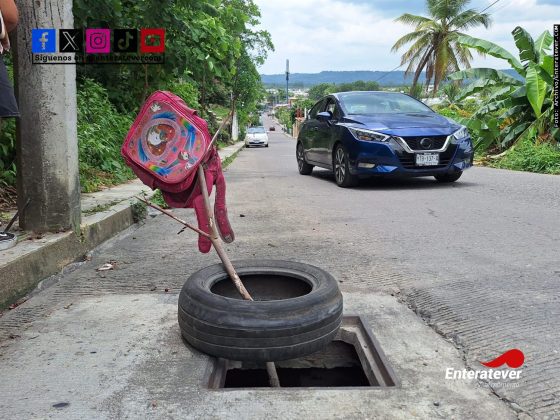 Vecinos de la calle Tuxpan, en la colonia Reforma, han improvisado una señal de advertencia utilizando una mochila, un palo y una llanta para alertar a automovilistas y peatones sobre una rejilla colapsada que representa un serio peligro.