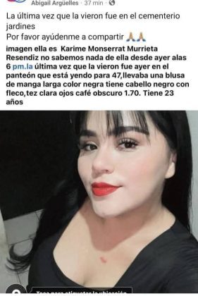 Uno de los casos es el de Karime Monserrat Murrieta Reséndiz, quien fue vista por última vez alrededor de las 6:00 de la tarde en el Cementerio Jardines, ubicado rumbo a la colonia 47; de acuerdo con la información difundida, mide aproximadamente 1.70 metros, es de tez clara, ojos cafés oscuro y cabello negro con fleco.
