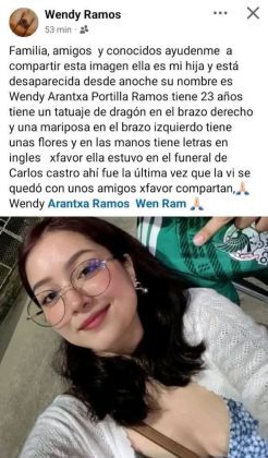 El otro reporte corresponde a Wendy Arantxa Portilla Ramos, también de 23 años, quien fue vista por última vez cuando acudía al funeral del reportero Carlos Castro, en compañía de amigos; desde entonces, no se tiene información certera sobre su ubicación.