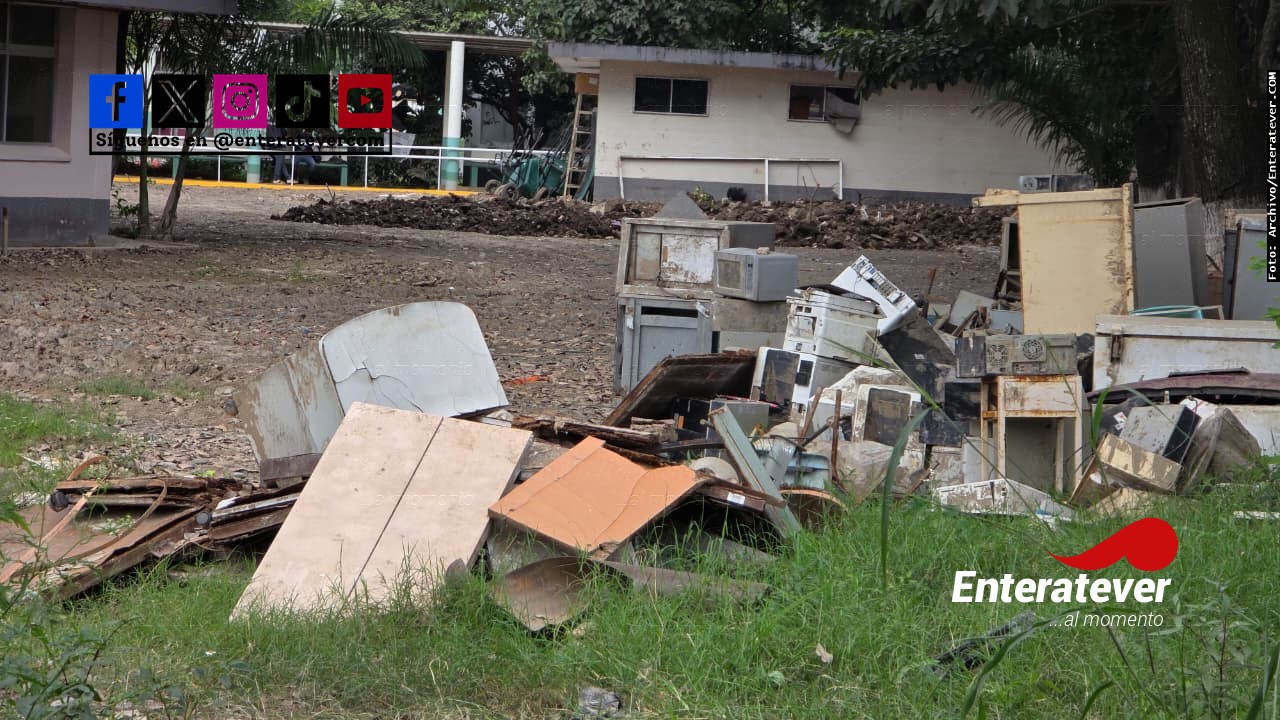 En la zona posterior del edificio se mantiene concentrado mobiliario, equipo y material diverso que resultó dañado, el cual no ha sido retirado y permanece almacenado mientras se determinan las acciones correspondientes para su limpieza o rehabilitación.