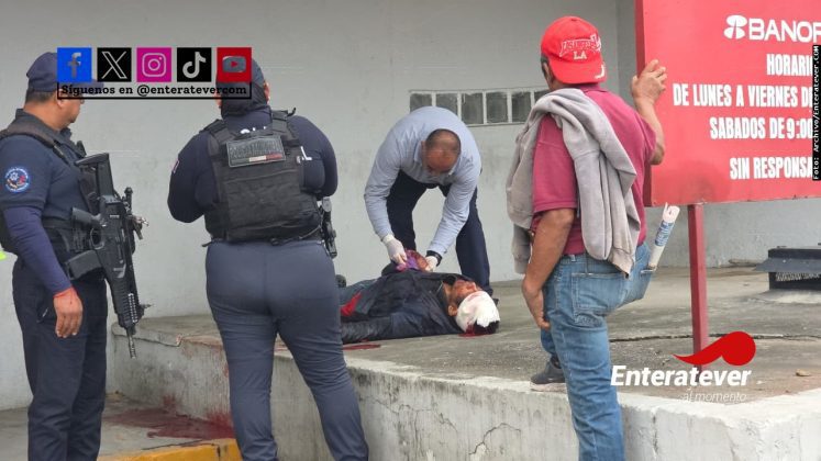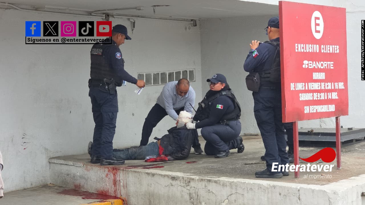 Poza Rica, Ver.- Momentos de tensión se vivieron en la zona centro de Poza Rica luego de que un hombre, visiblemente ensangrentado por una herida provocada con arma blanca, ingresara al estacionamiento de una sucursal bancaria de Banorte para solicitar auxilio.