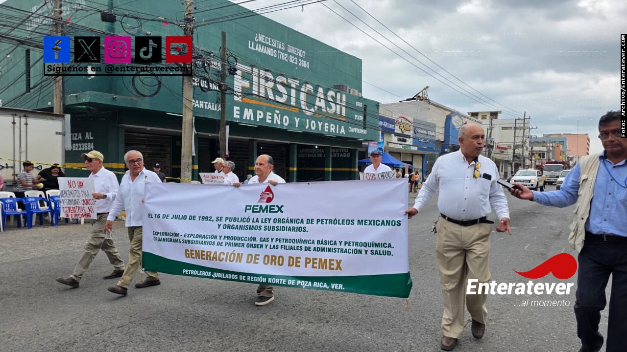 Poza Rica, Ver.- Las carencias en atención médica, la falta de medicamentos y especialistas en el Hospital Regional de Pemex, así como el trato que califican como indigno, llevaron a integrantes de la Asociación de Petroleros Jubilados de Confianza (APEJUCO A.C.) a manifestarse durante el desfile conmemorativo del 18 de marzo.