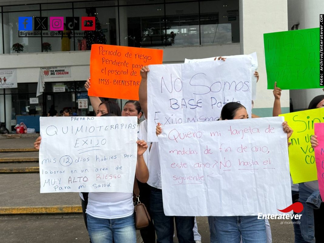 Poza Rica, Ver.- Trabajadores de la salud del IMSS Bienestar se manifestaron en el Hospital Regional de Poza Rica para exigir el pago de su bono de fin de año, la entrega de vales de despensa y uniformes, el respeto a sus vacaciones y el cumplimiento de la semana de riesgo, prestaciones que aseguran no han sido otorgadas por las autoridades estatales.