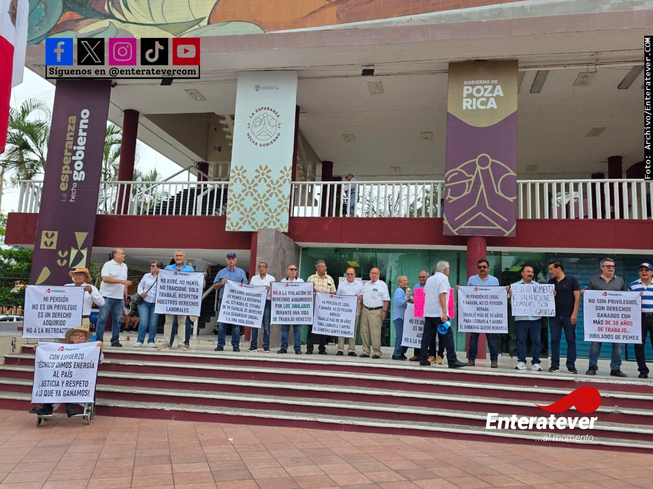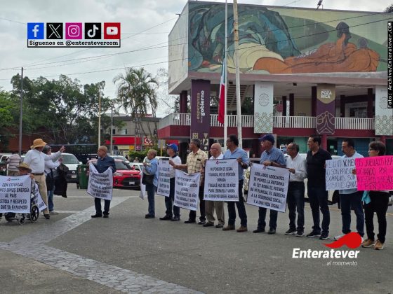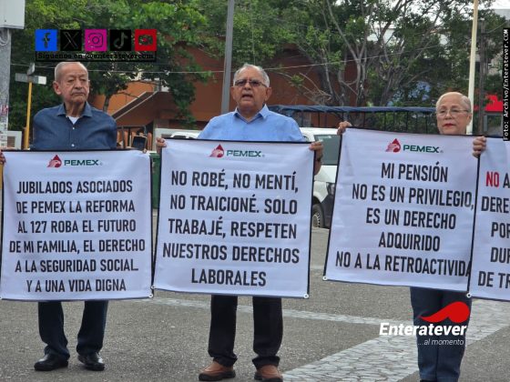 Poza Rica, Ver.- Jubilados petroleros se manifestaron en la explanada del Ayuntamiento para rechazar la reforma al artículo 127 constitucional, al señalar que representa un riesgo directo para sus ingresos y derechos adquiridos tras años de servicio.