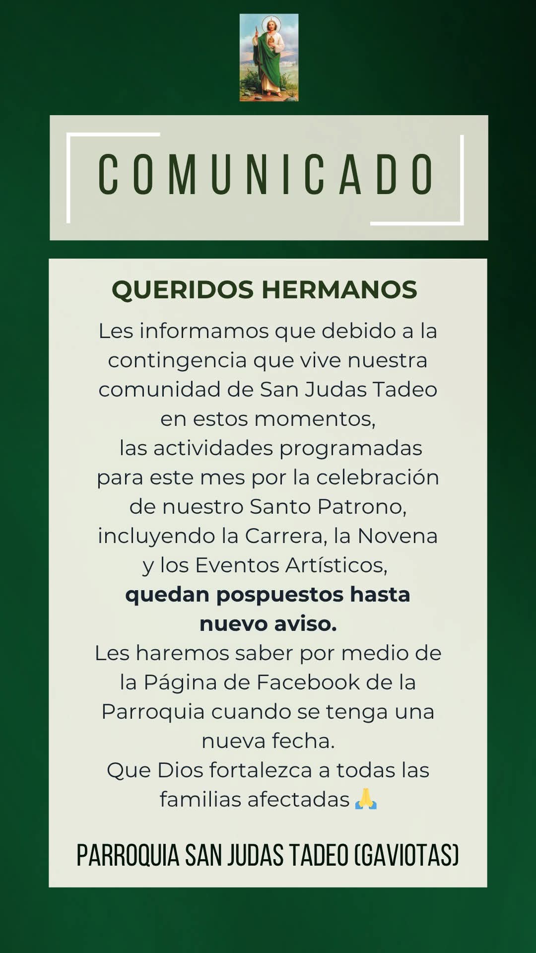 La parroquia San Judas Tadeo, ubicada en el fraccionamiento Gaviotas, informó a través de sus redes sociales que, debido a la contingencia que se vive en la ciudad tras la inundación del pasado 10 de octubre, se posponen las actividades programadas para la celebración del Santo Patrono.