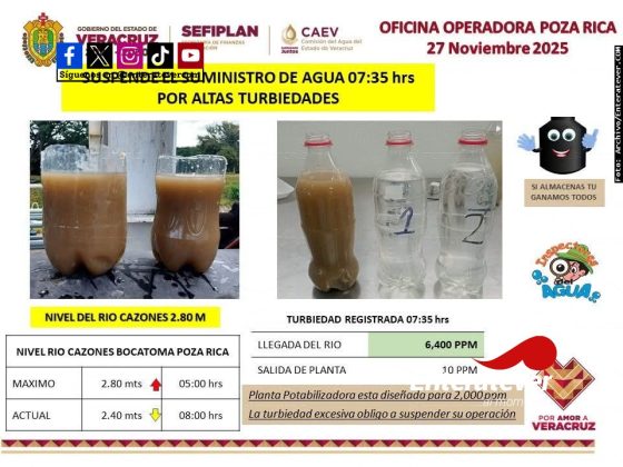 Poza Rica, Ver.- Por segunda ocasión en pocas semanas, Poza Rica enfrenta la suspensión del suministro de agua potable luego de que la Comisión de Agua del Estado de Veracruz (CAEV) se viera obligada a detener la operación de su planta potabilizadora debido al incremento repentino de la turbiedad registrada durante la madrugada de este jueves.
